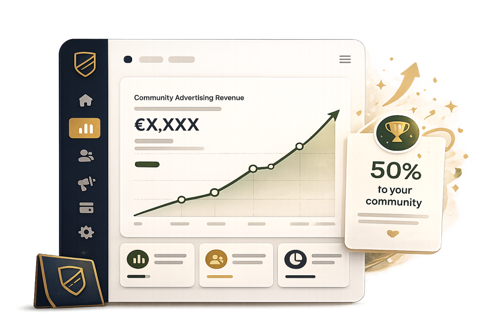 Every euro of advertising revenue generated on your platform is split 50/50. Half stays with SocialTies to run and develop the platform. The other half is reinvested directly back into your community — your grounds, your players, your projects, your priorities.
